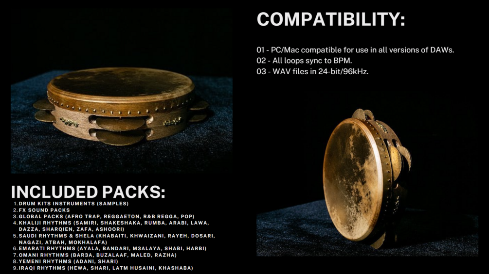 A professional all-in-one Khaliji percussion library designed for music producers, composers, and DJs searching for authentic Gulf rhythms, Saudi sheilat percussion, Arabic drum samples, and production-ready WAV libraries that work naturally inside modern DAWs.